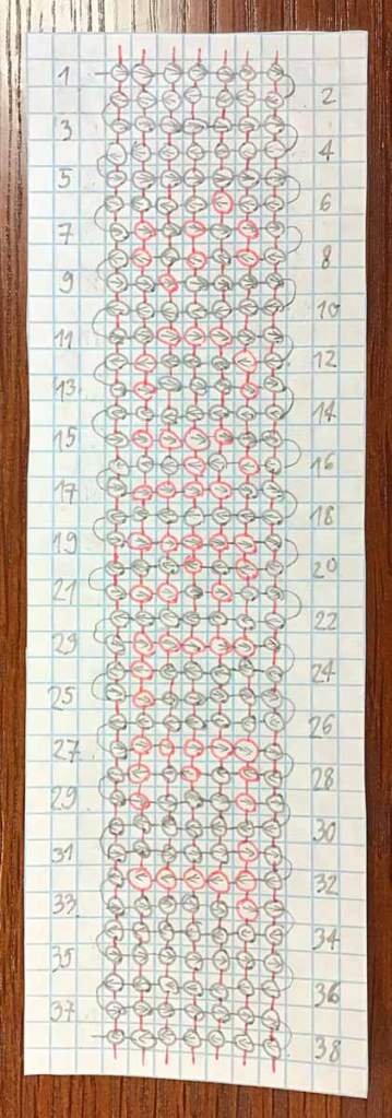 Normal Bracelets are really easy to knot. You choose your strings and your pattern – and you start. Beginners often choose diamond pattern with this technique, because they are done pretty quick, you don’t have to add new strings while you’re working on it and they always have a repetitive pattern. It gets a little more complicated when the elements in the pattern wave into each other, but after doing it two to three times, you remember the pattern automatically while you’re continuing.